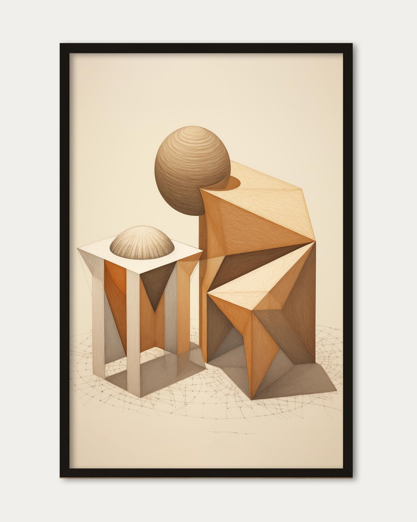 The Cubic Figure Art Print features a striking illustration of a surreal wooden sculpture depicting a figure. This unique artwork combines imaginative design with bold form, adding a captivating and artistic focal point to any space. Perfect for those seeking to enhance their décor with creative and thought-provoking style.