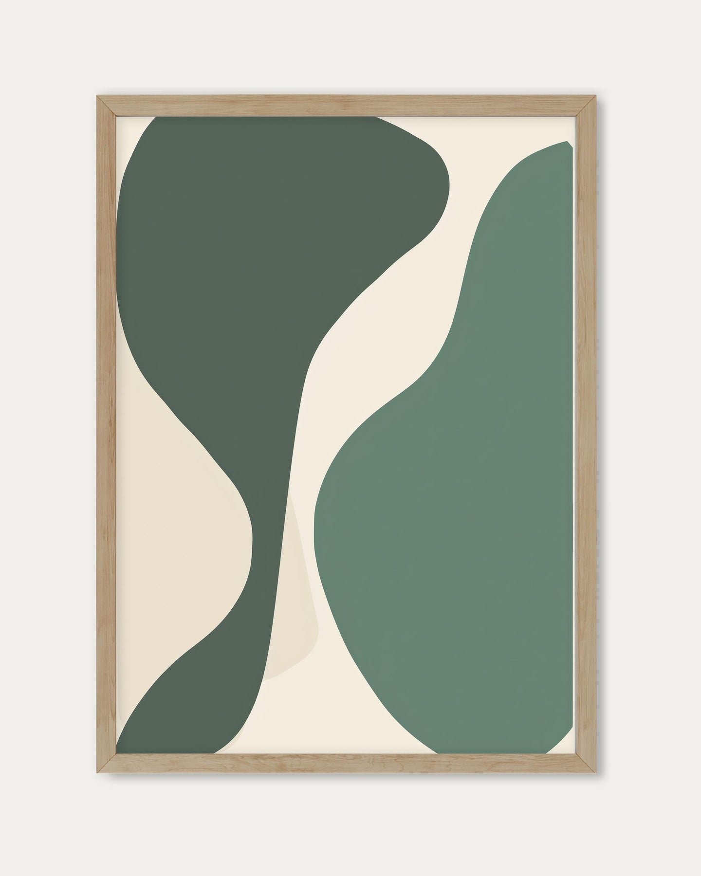 The Green Organic Wall Art Print features large, abstract organic shapes in soft olive green tones. This modern, minimal design adds a calming and sophisticated touch to any space, perfect for those seeking understated elegance with a natural-inspired aesthetic.