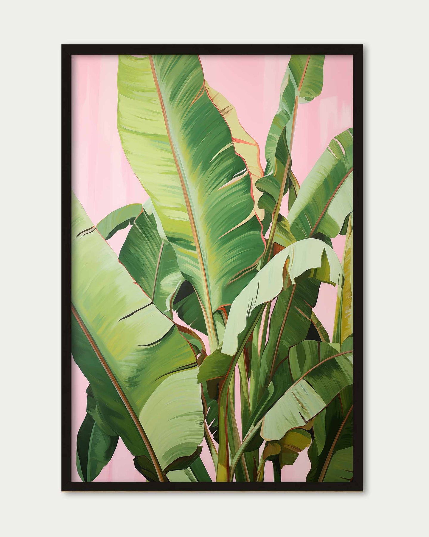 The Banana Tree Illustration Wall Art features modern green banana tree leaves set against a vibrant pink contemporary background. This striking print adds a bold yet fresh touch to your space, perfect for those seeking to infuse their décor with lively colour and stylish botanical flair.