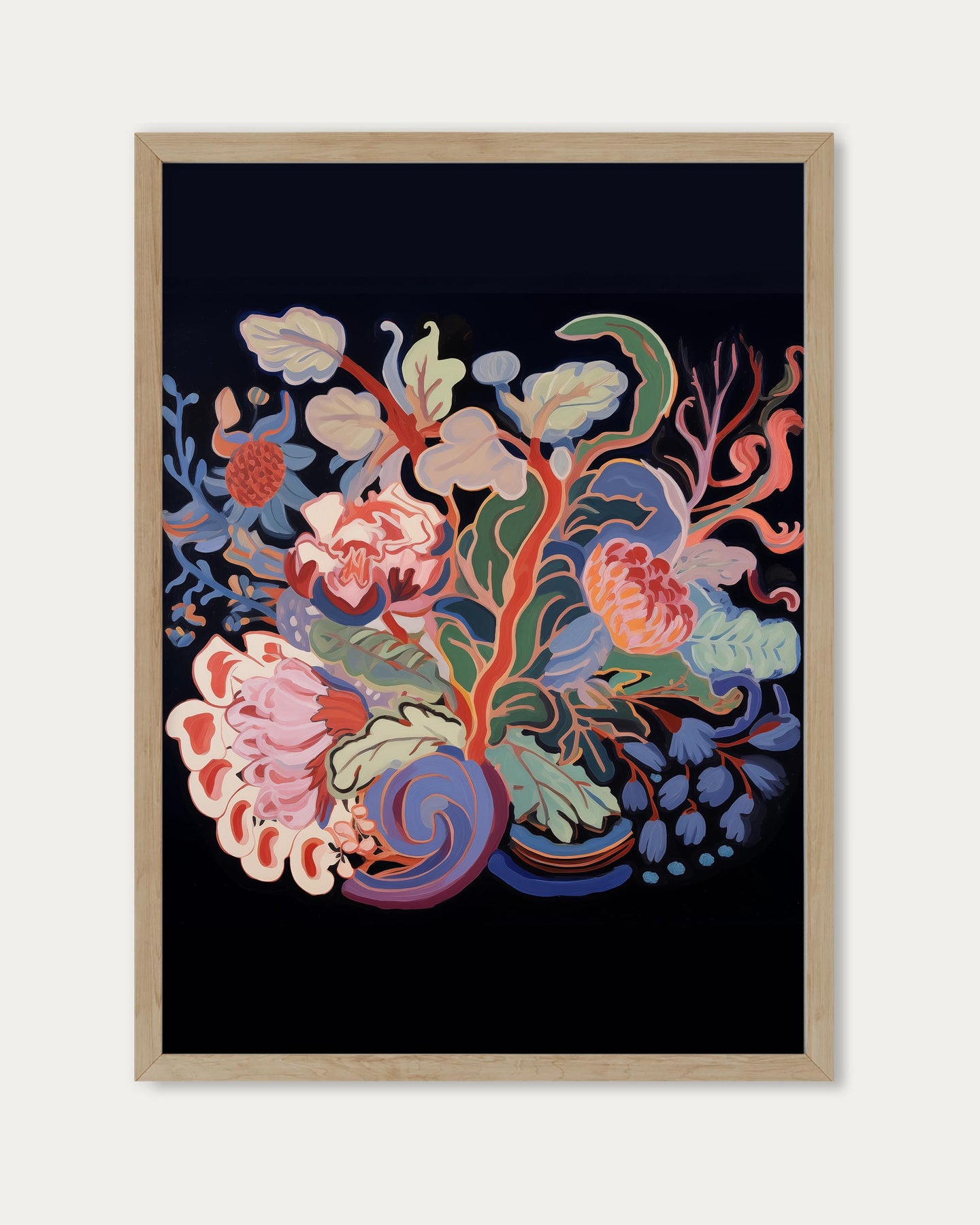 The Night Garden Art Print features surreal flowers set against a deep black background, creating a striking contrast that highlights their mysterious beauty. This captivating artwork adds a dramatic and enchanting touch to any space, perfect for those seeking a bold and imaginative statement piece for their décor.