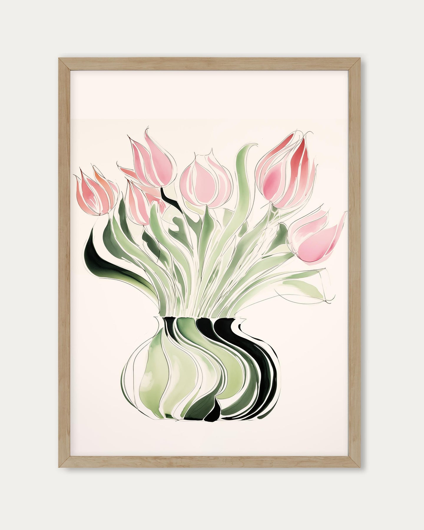 The Pink Flowers Art Print features a minimal drawing of delicate pink flowers with green stems arranged in a surreal vase. This elegant artwork adds a subtle and modern botanical touch to any space, perfect for enhancing your décor with understated beauty and contemporary style.