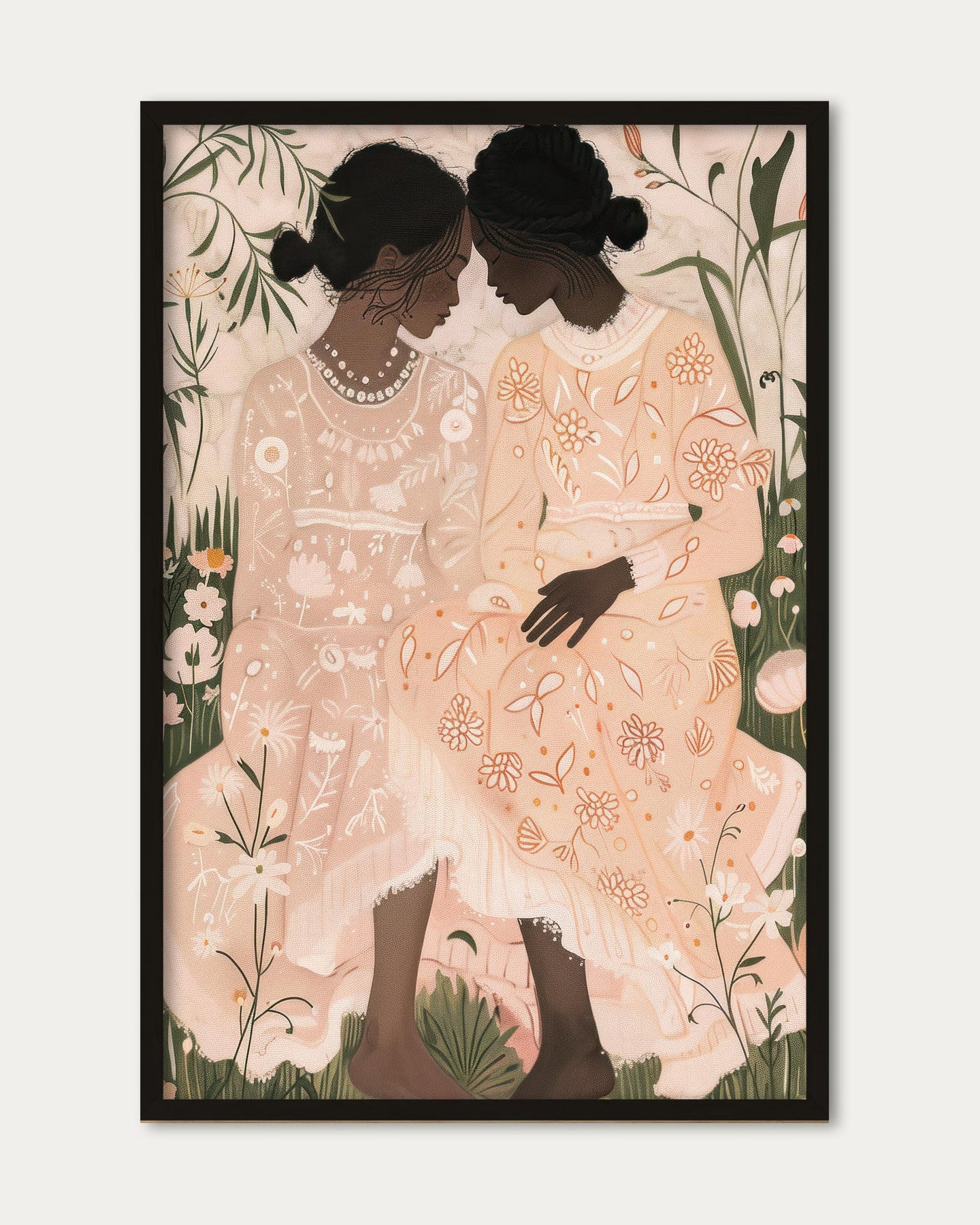 The Floral Dress Art Print features a figurative portrait of twins dressed in pink, capturing a tender and harmonious moment. This charming artwork adds warmth and gentle beauty to any space, perfect for enhancing your décor with heartfelt emotion and soft colour.