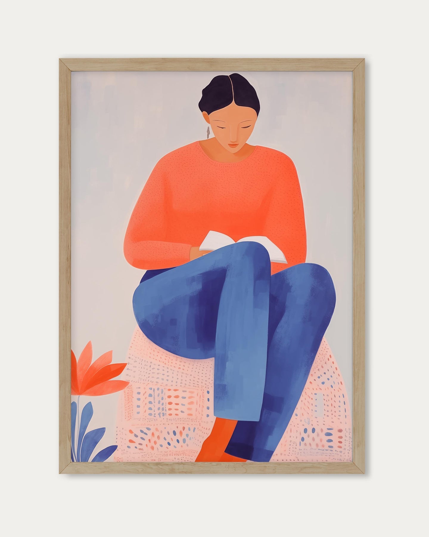 The Reading Nook Art Print features a playful illustration of a woman reading a book, dressed in a vibrant red top and blue jeans. This lively artwork adds a cheerful and cozy touch to any space, perfect for brightening your décor with warmth and personality.