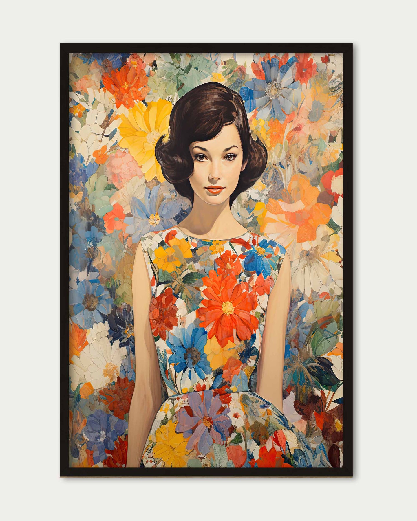 The Hiding Wall Art Print features a sophisticated figurative painting of a woman in a floral dress, rendered in rich, deep colours. This vibrant artwork combines bold floral patterns with elegant composition, creating a captivating piece that adds depth and refined beauty to any space. Perfect for those seeking a striking yet tasteful statement in their décor.