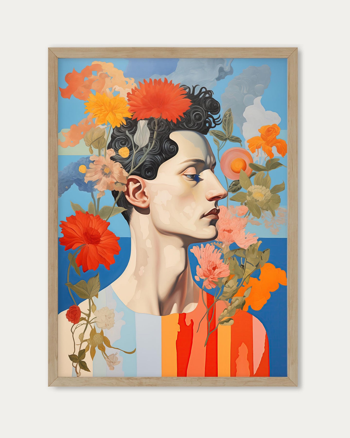 The Horizon Wall Art Print presents a sophisticated surreal portrait of a man surrounded by vibrant flowers in striking orange and blue shades. This imaginative composition combines bold colour with powerful imagery, creating a captivating focal point that adds depth and artistic intrigue to any space.