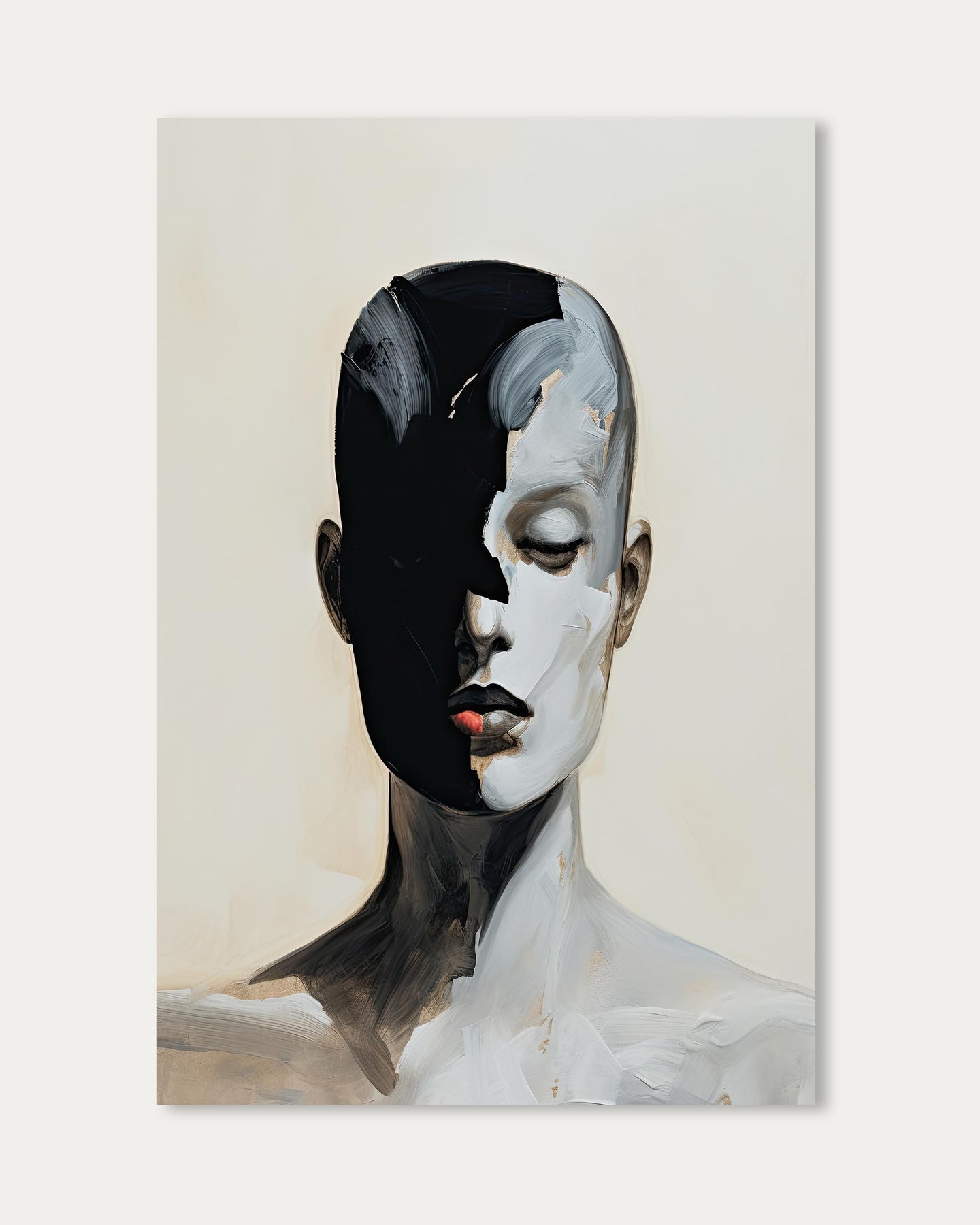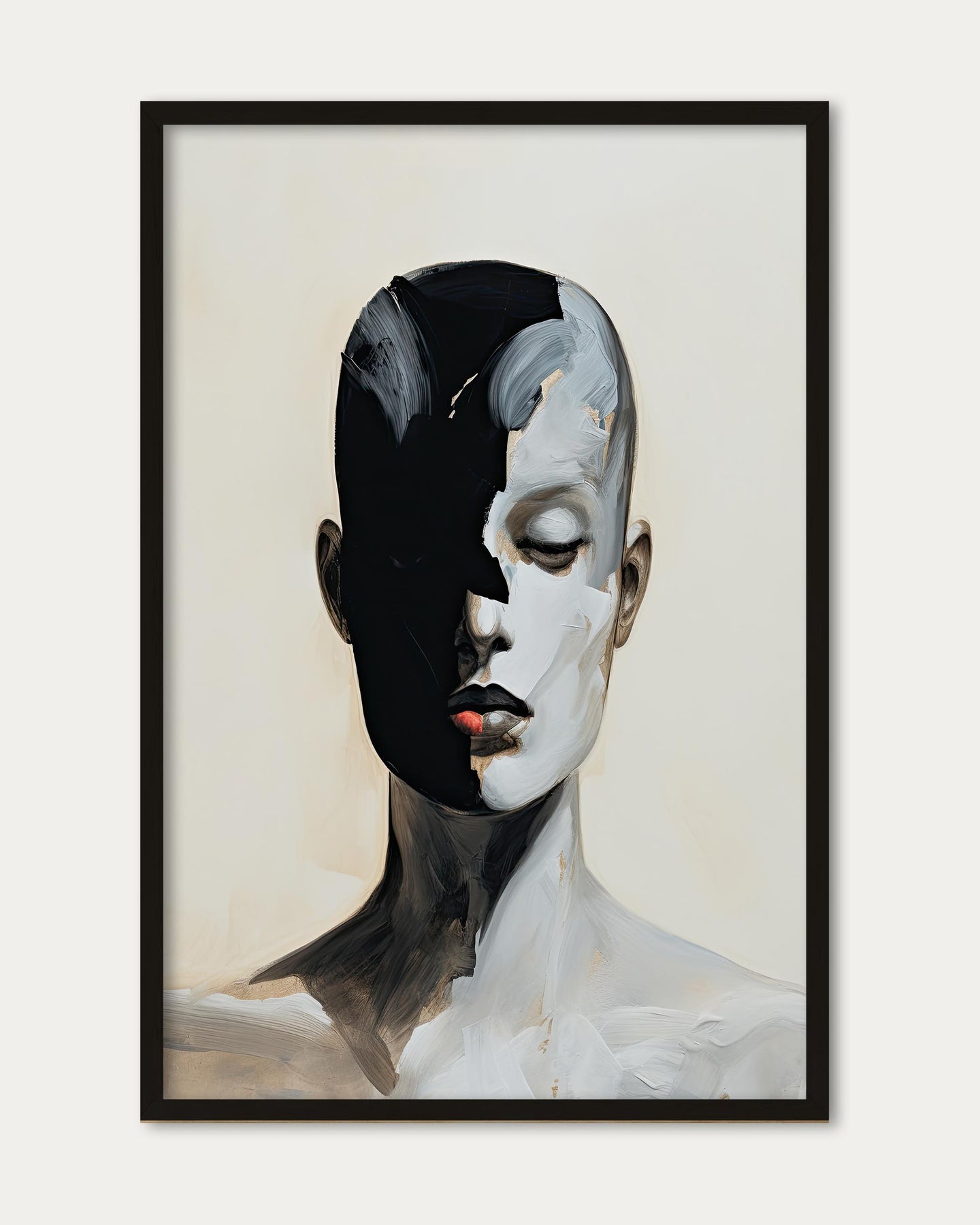 The Mind Over Matter Art Print features a surreal and abstract monochrome portrait of a face, blending expressive lines and shapes to create a thought-provoking composition. This striking artwork adds a bold and contemporary touch to any space, perfect for enhancing your décor with artistic depth and modern flair.