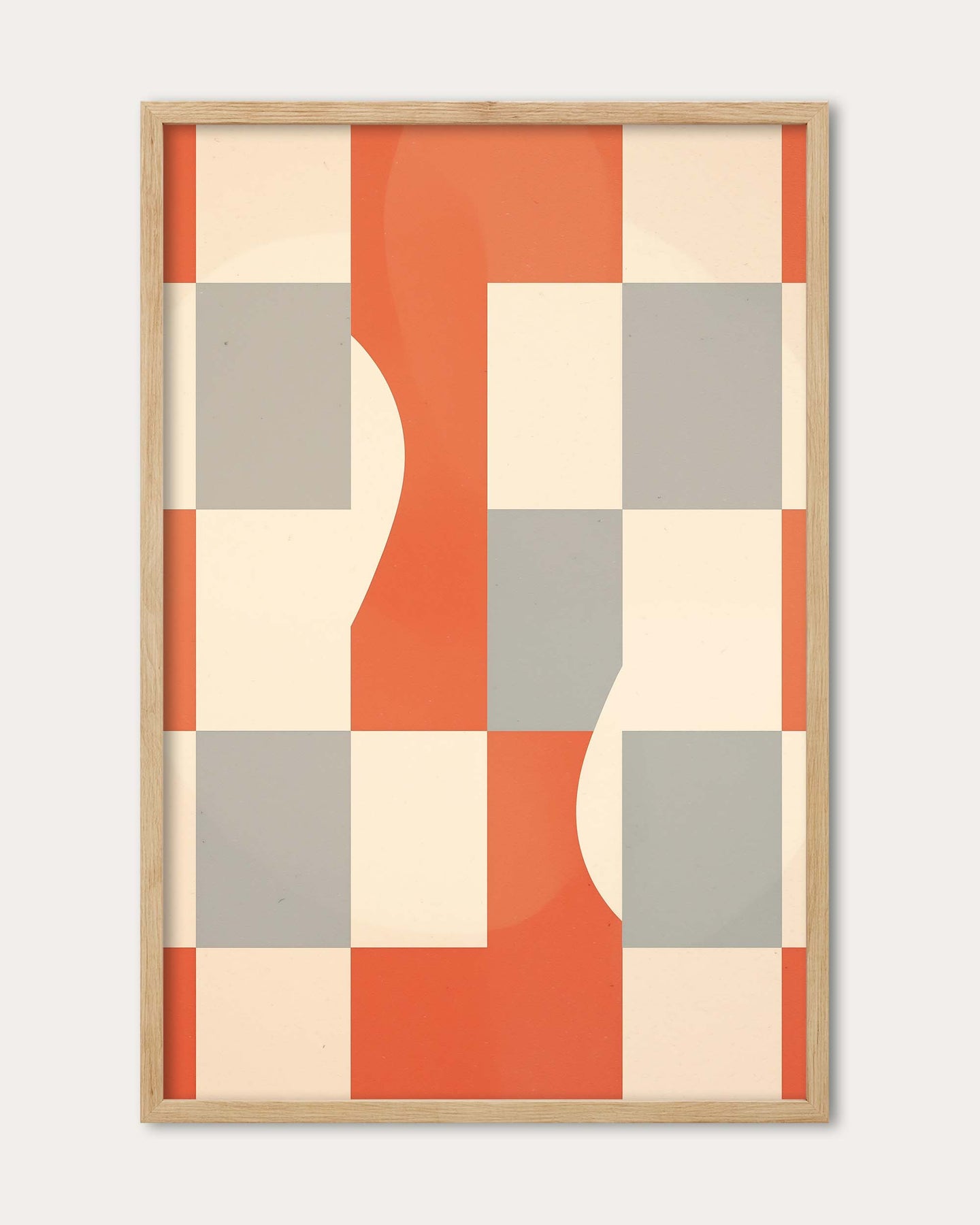 The Checkers Art Print features a geometric abstract design inspired by a chessboard, combining warm orange, beige, and grey squares. This bold artwork adds a modern and dynamic touch to any space, perfect for enhancing your décor with striking patterns and contemporary style.