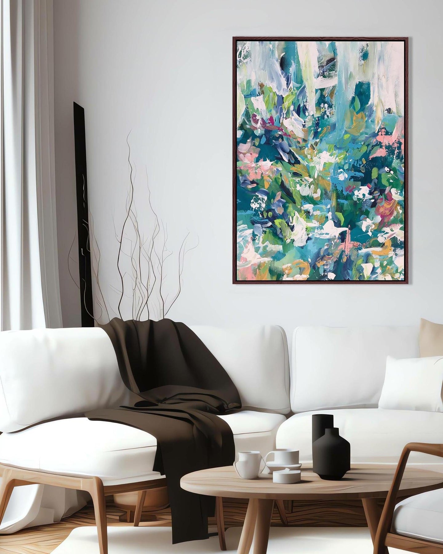 Modern living room with a colorful abstract painting on the wall.