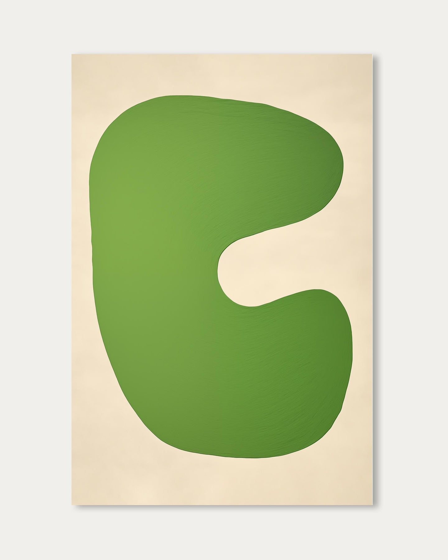 Geometric wall art print featuring a contemporary green organic shape in abstraction. The rich avocado green and beige colour palette offers a strong contrast, perfect to add colour to any room.