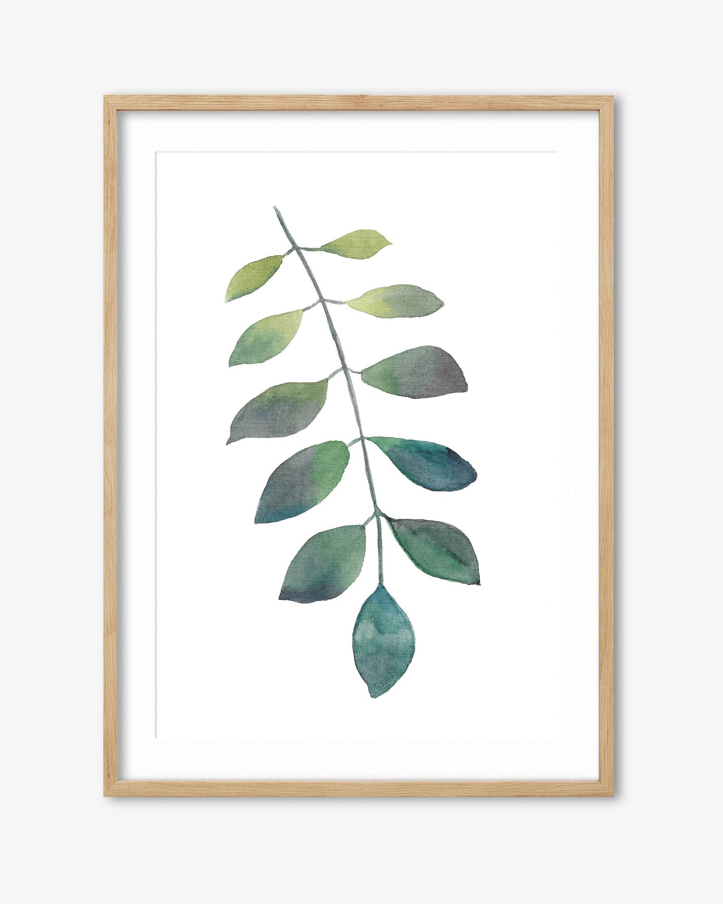 The Dog Leaf Watercolour Art Print features a minimalist botanical design of a slender leaf stem rendered in soft watercolour. Its delicate simplicity enhances any space with a subtle touch of natural elegance, ideal for refined and modern interior decor.