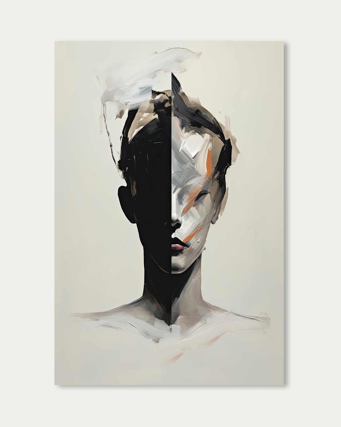The Mind Over Matter II Art Print features a surreal monochrome painting of a face, blending abstract elements with expressive detail. This captivating artwork adds depth and intrigue to any space, perfect for enhancing your décor with bold artistic expression and modern sophistication.
