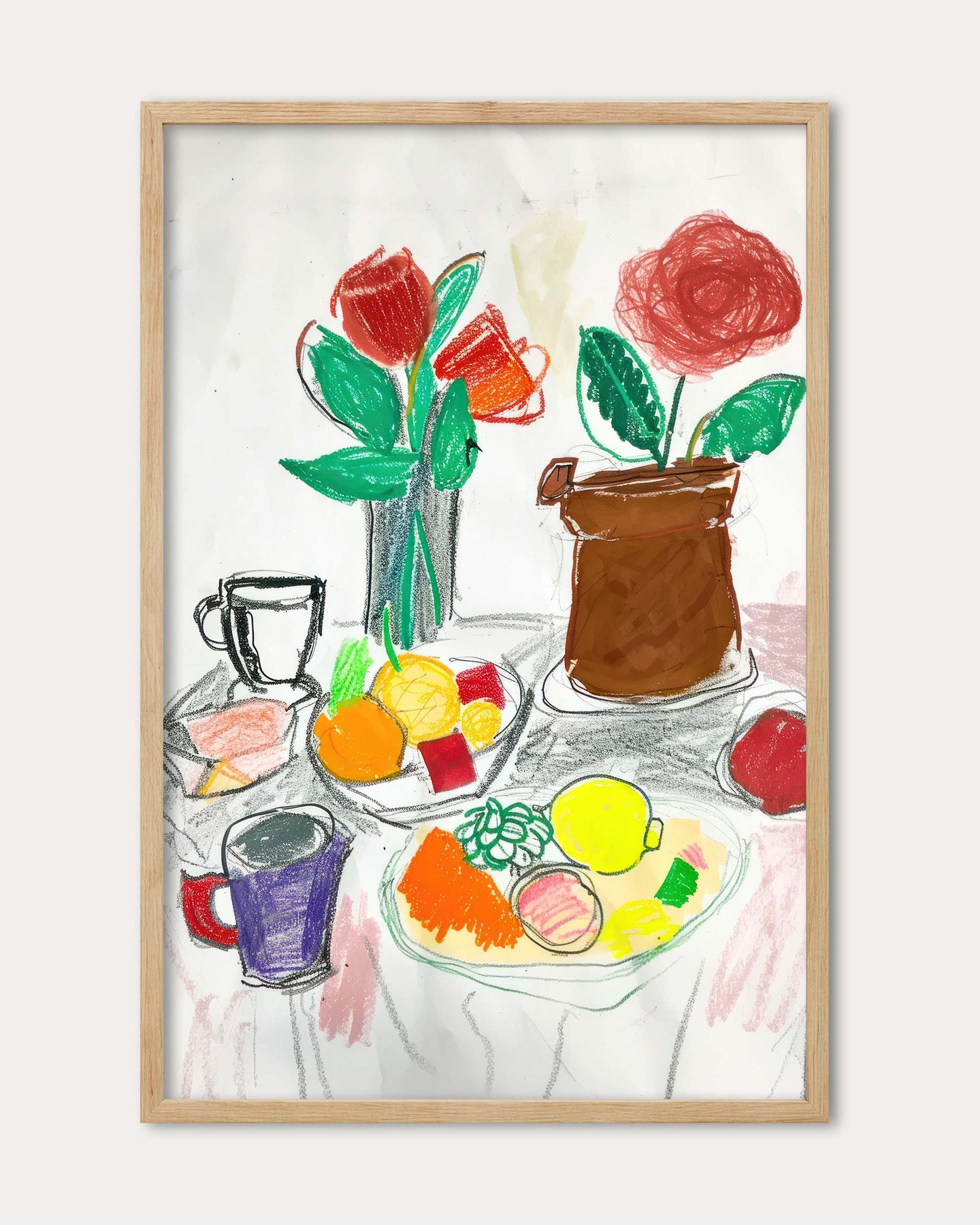 The Dinner Date Art Print features a delicate sketch of a still life scene with fruit on a table accompanied by flowers in vases. This charming artwork adds a warm and inviting touch to any space, perfect for enhancing your décor with subtle elegance and natural beauty.