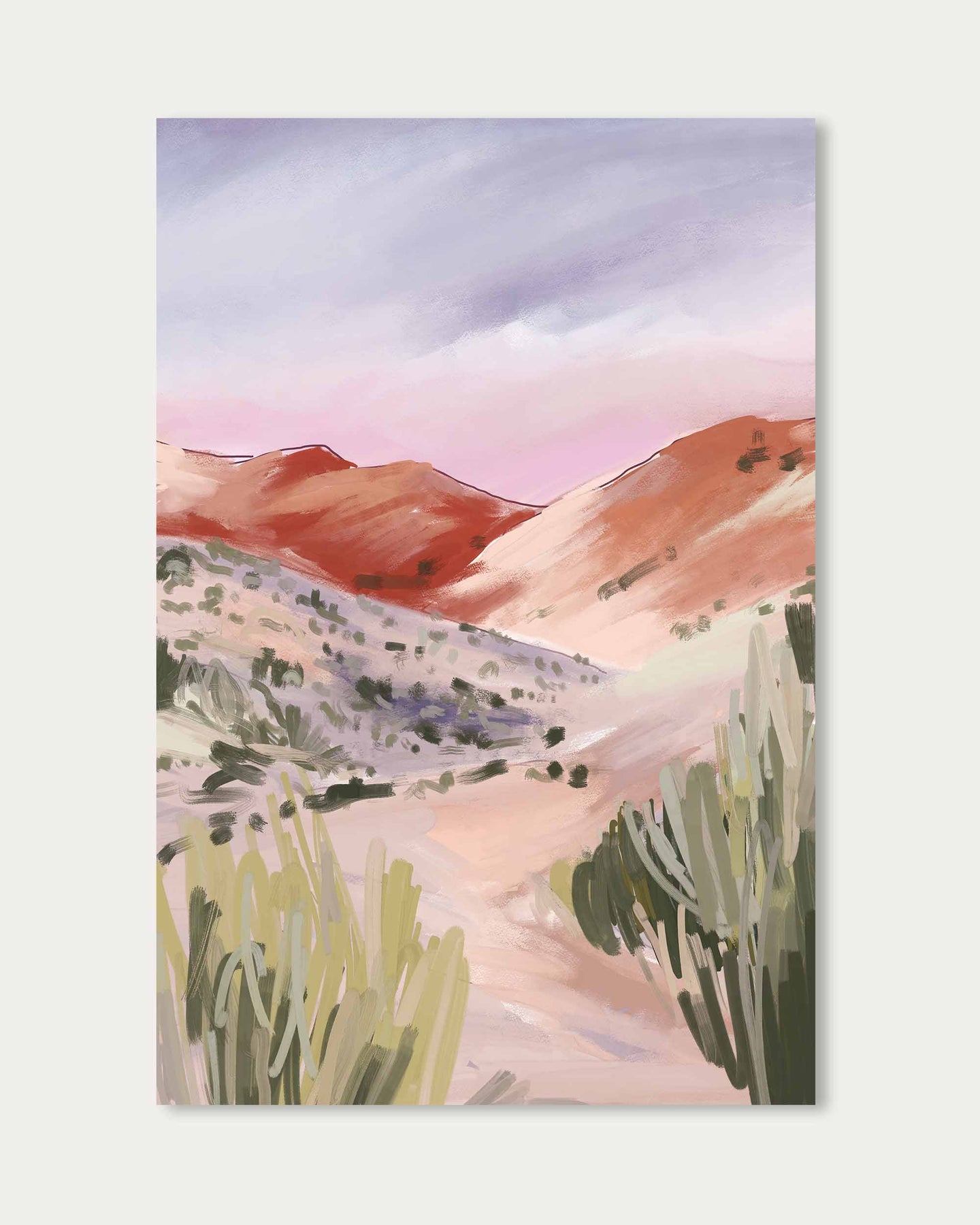 The Over The Hill Wall Art features a delicate watercolor painting of a winding path through the desert. This serene artwork brings a sense of calm and natural beauty to any space, perfect for adding a subtle and peaceful touch to your décor.