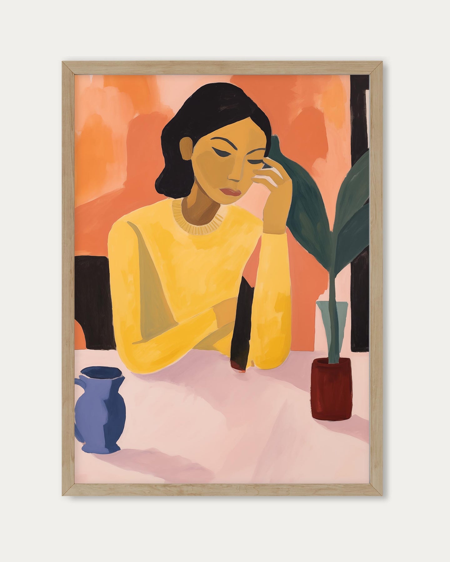 The Sofia Art Print features a captivating figurative painting of a woman sitting gracefully on a table. This elegant artwork brings a sense of poise and modern artistry to any space, perfect for adding a sophisticated and expressive touch to your décor.