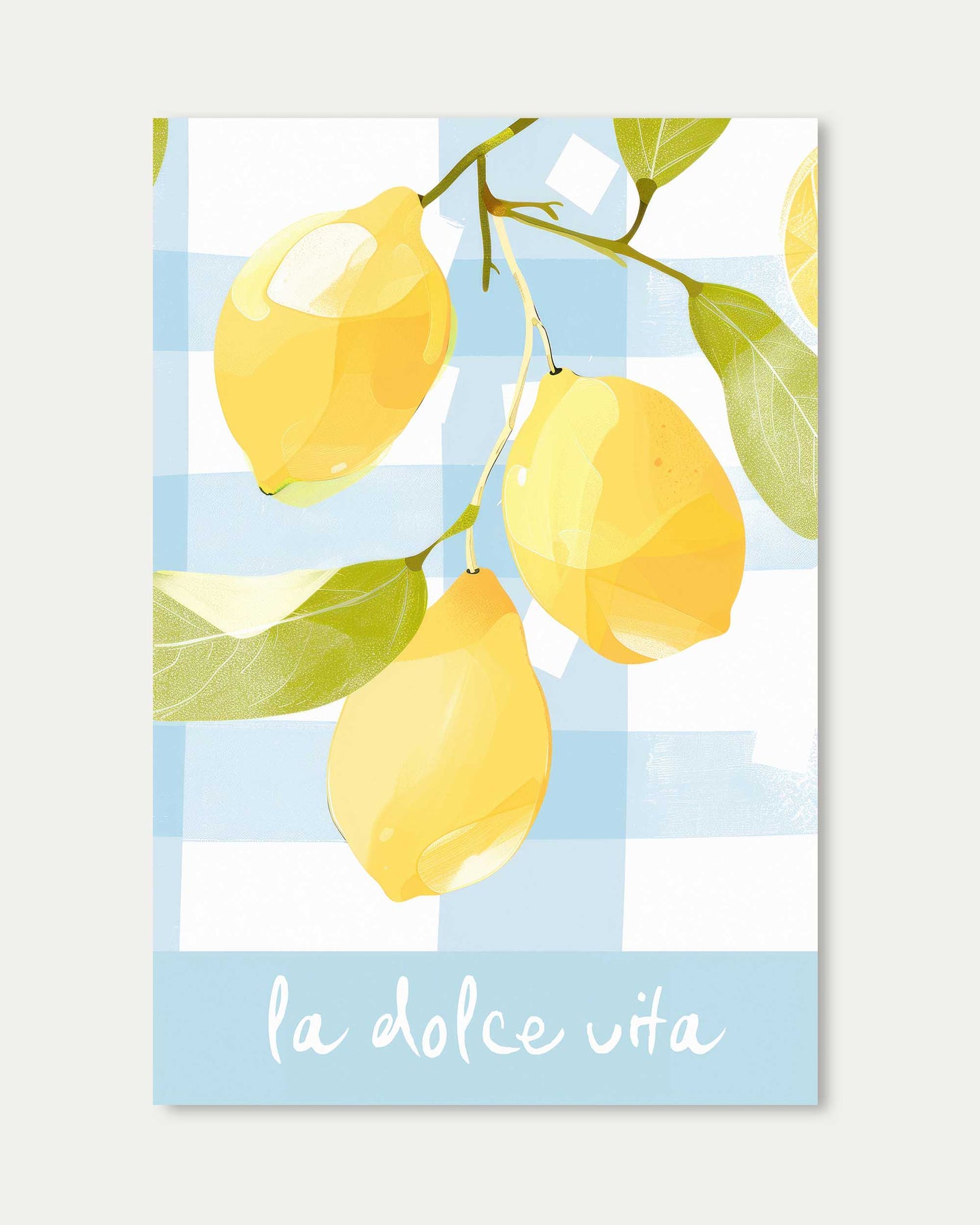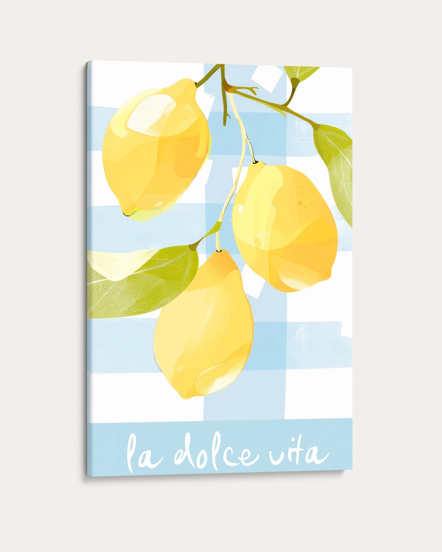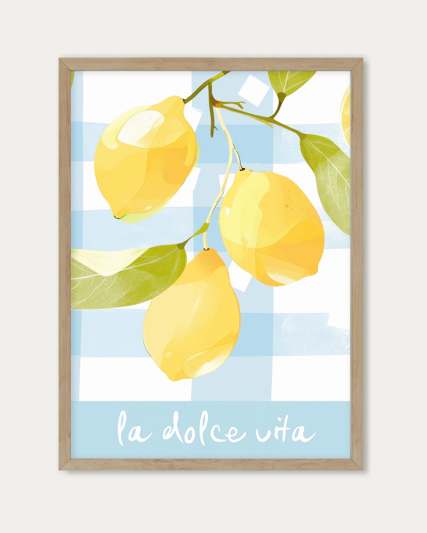 The Vita Wall Art features a vibrant illustration of yellow lemons set against a blue and white patterned background. This lively artwork brings a fresh and cheerful touch to any space, perfect for adding a burst of colour and Mediterranean charm to your décor.
