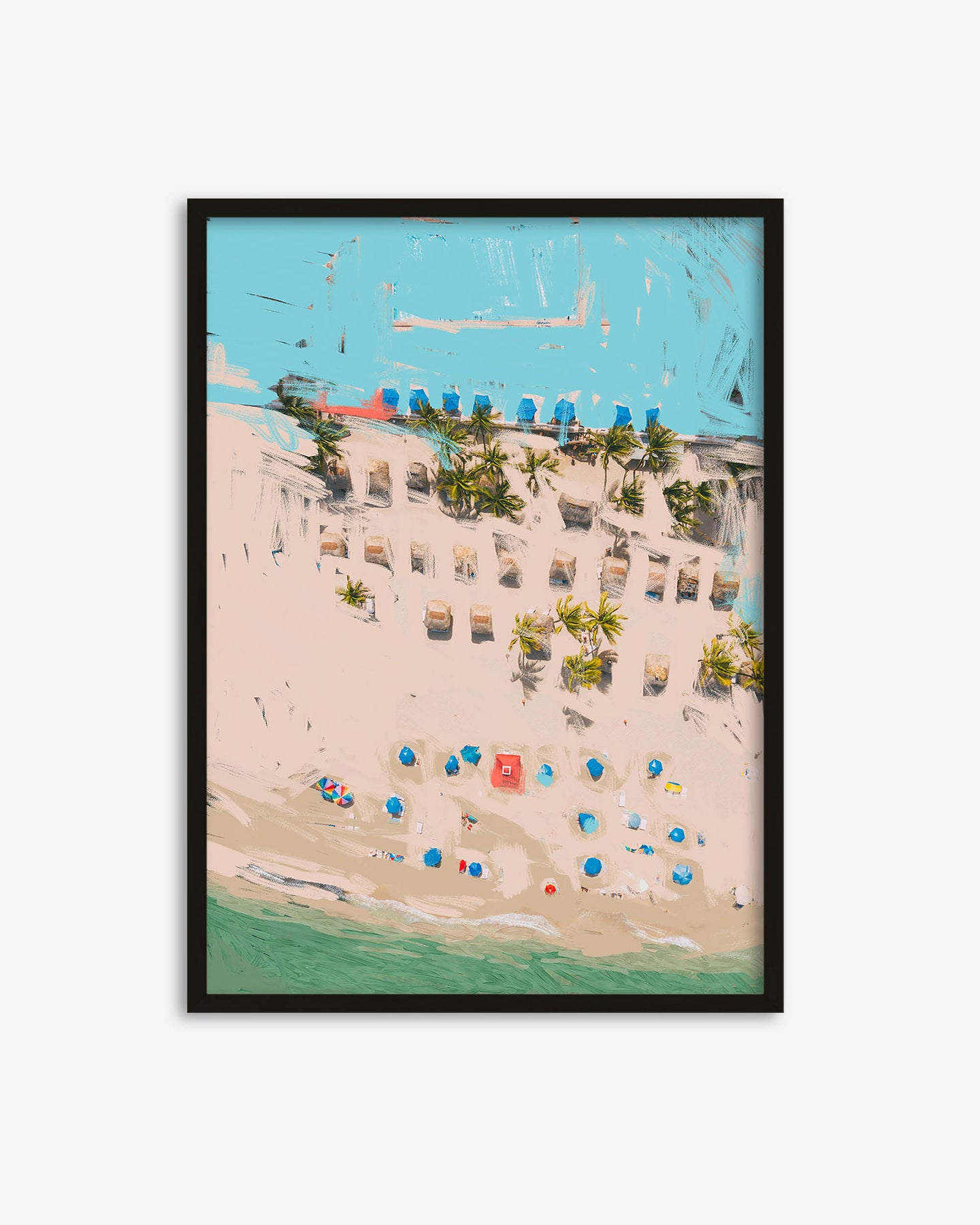 Escape to the stunning tranquil coastline of the Riviera with crystal clear turquoise waters with our exclusive Beach Study Framed Print. A beautiful abstract expressionist beach print, featuring an aerial view of a sandy beach with palm trees and beach umbrellas blowing in the wind.
