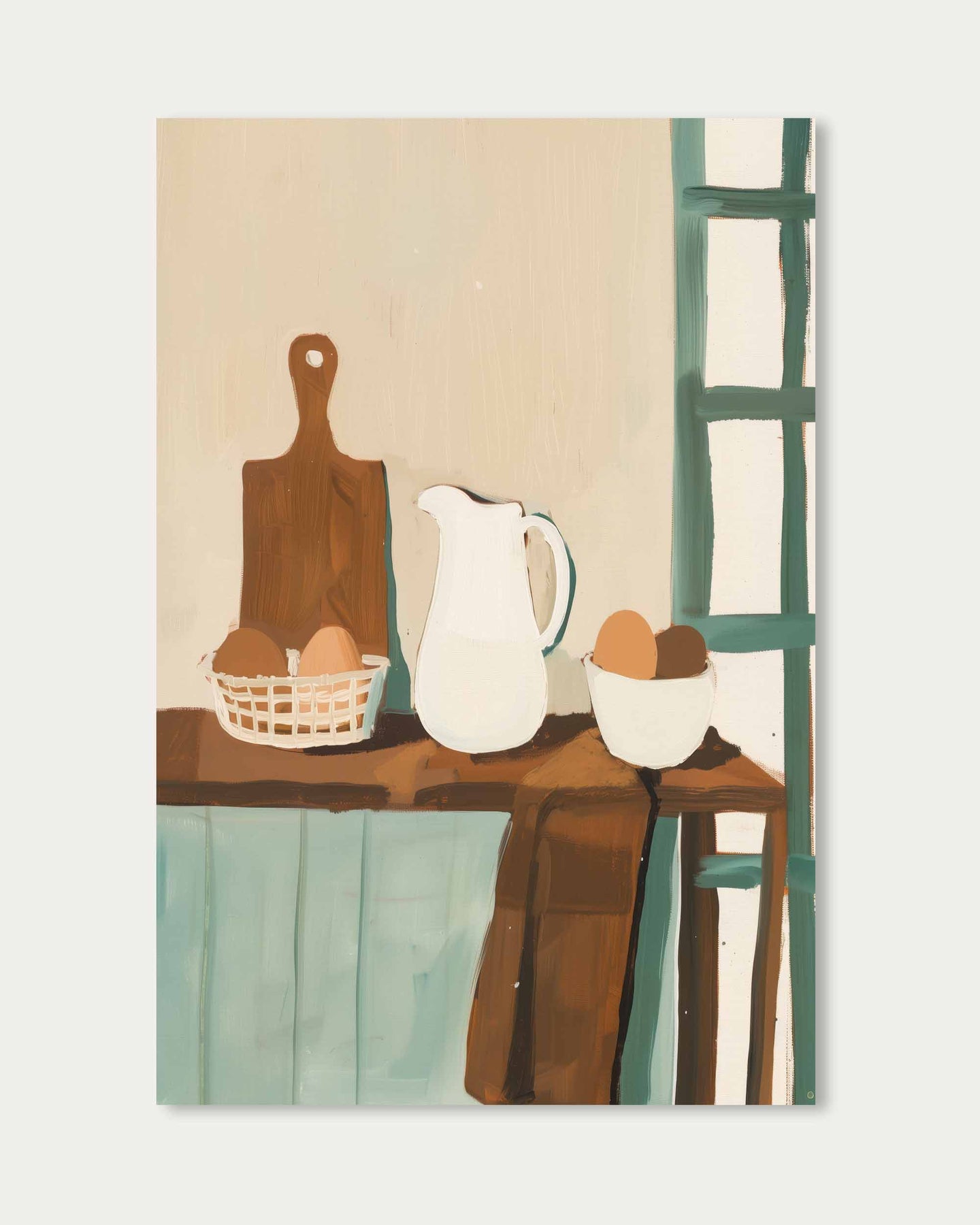 The In The Kitchen Wall Art Print captures a charming still life scene of a milk jug and fresh fruit arranged on a kitchen countertop, evoking the cozy warmth of a cottage farmhouse kitchen. This inviting painting adds rustic elegance and timeless comfort to your space, perfect for creating a welcoming atmosphere in any home.