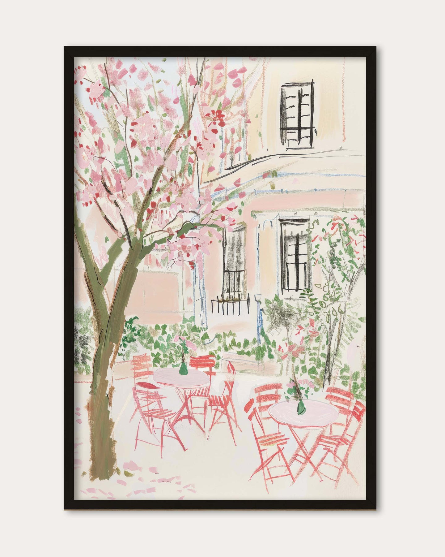 The Lunch In Paris Wall Art features a charming sketch of a Parisian café with inviting outdoor seating and blooming flowers. This delightful artwork captures the romantic ambiance of the city, perfect for adding a touch of elegance and wanderlust to your décor.