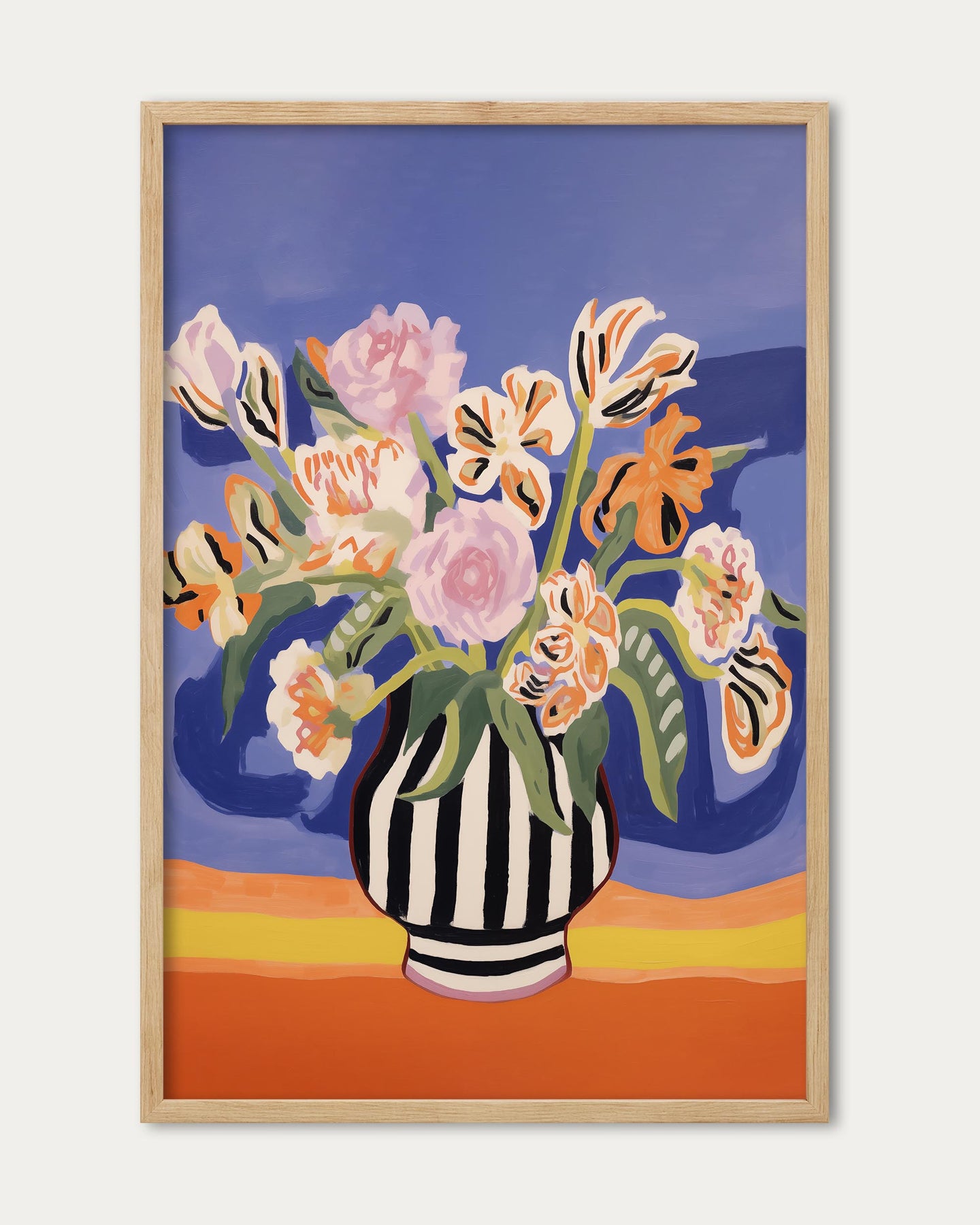Modern illustrative botanical art print featuring a beautiful bouquet of flowers including Iris, Chrysanthemum and more, placed in a black and white stripy vase. This vibrant poster features an orange and blue background and is filled with colour to add a modern touch to any space.