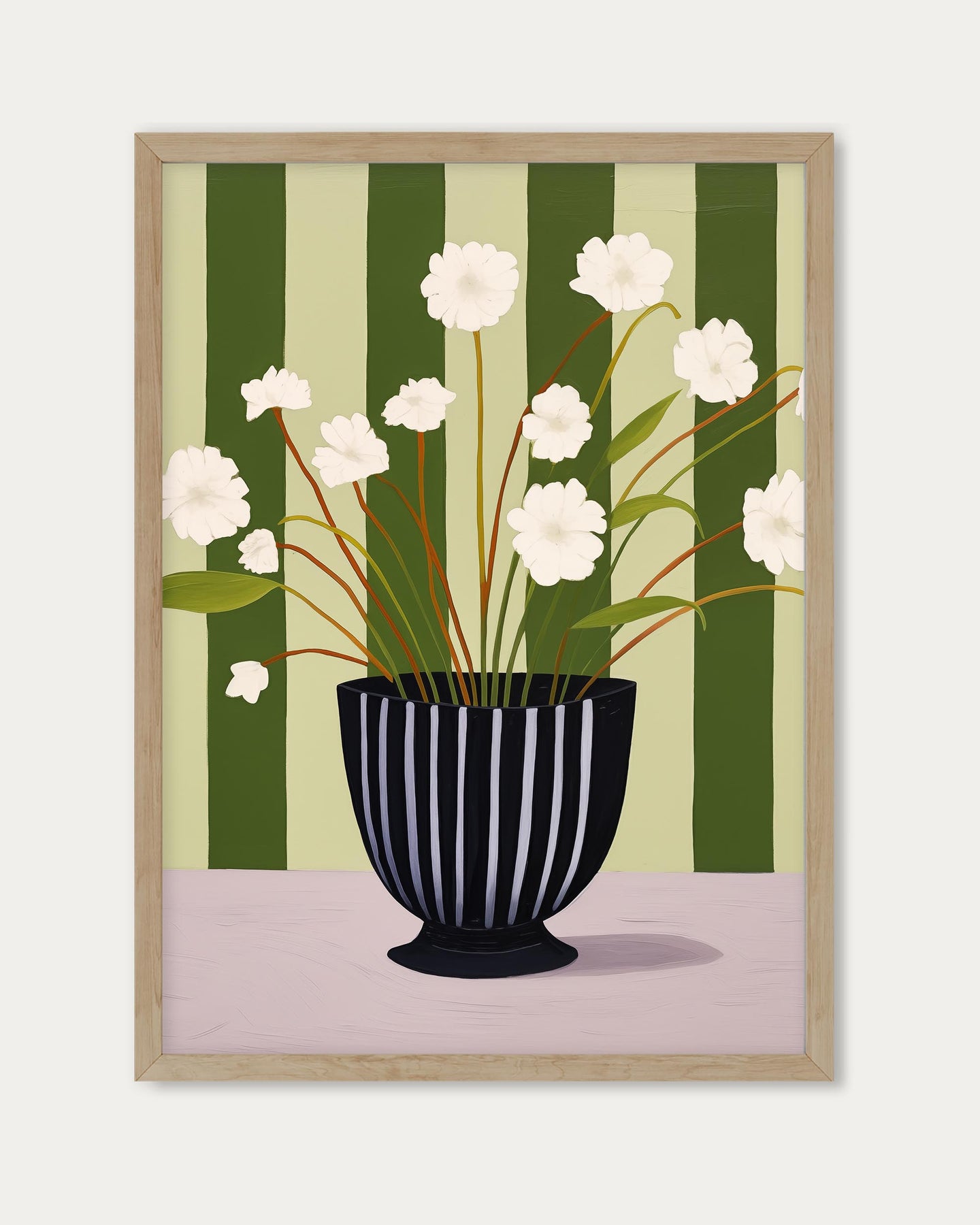 Enhance your walls with the Stripy Flower Pot Art Print, featuring an elegant illustration of white flowers against a vibrant green stripy background. This stylish artwork adds a fresh and sophisticated touch, perfect for brightening any room with natural charm.