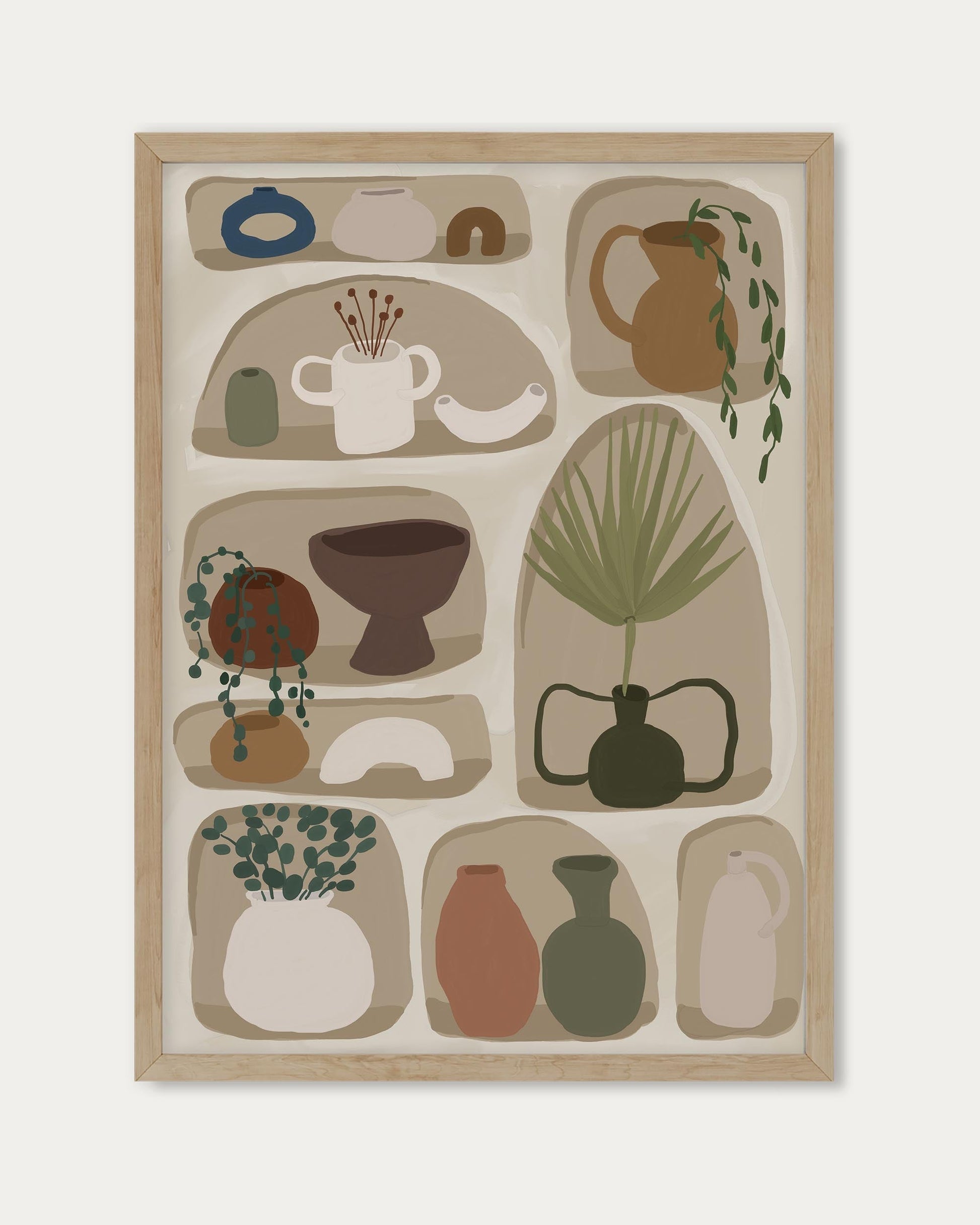 The Beige Decor Wall Art features a charming illustration of a modern bookcase filled with stylish items and potted plants. This warm and inviting artwork adds a cozy, contemporary touch to any space, perfect for bringing a sense of home and personality to your décor.