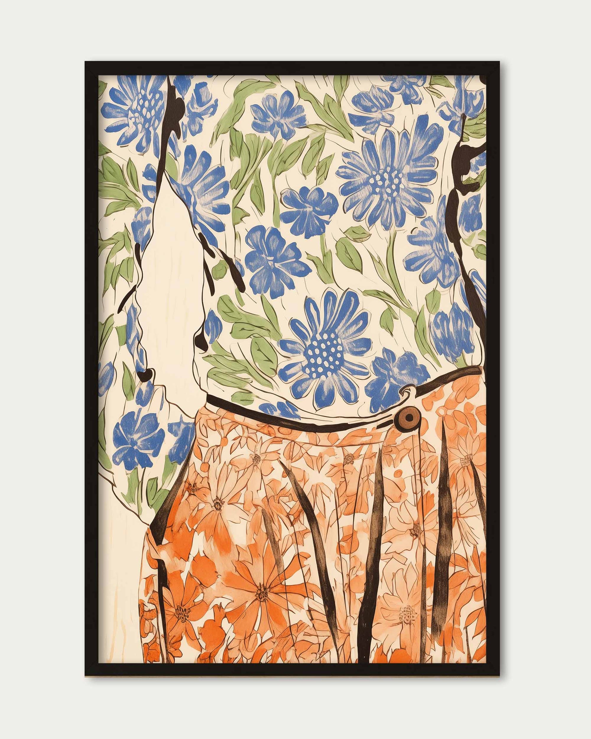 Brighten your space with the Floral Outfit Art Print, a vibrant and colourful figurative artwork celebrating botanical beauty. This lively piece combines floral patterns with artistic flair, perfect for adding a fresh, stylish touch to your walls.