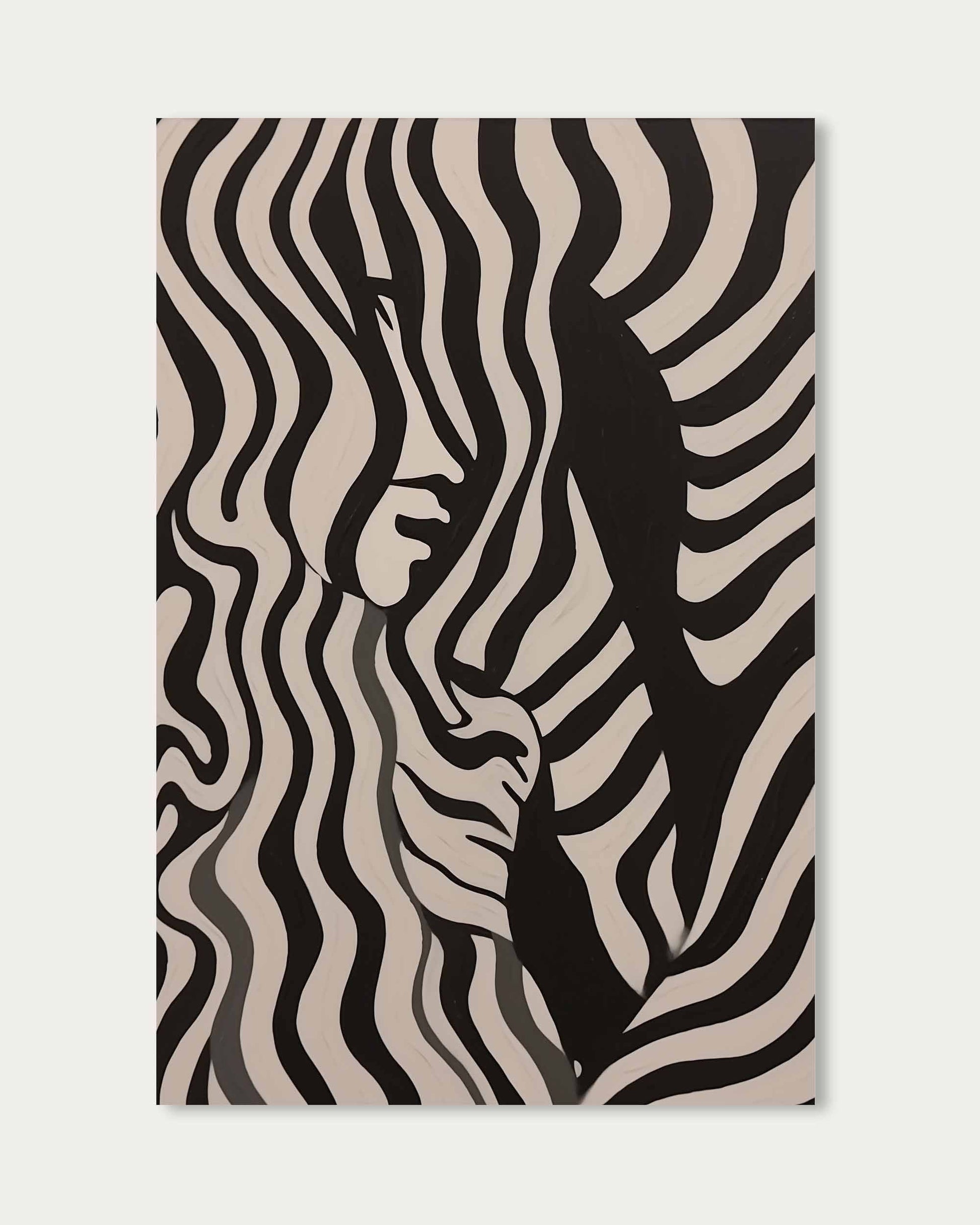 The Monochrome Shadows Art Print features surreal figurative forms created by colliding black lines on a beige background, representing figures emerging from the shadows. This evocative artwork adds depth and intrigue to any space, perfect for those seeking a thought-provoking and artistic statement piece for their décor.