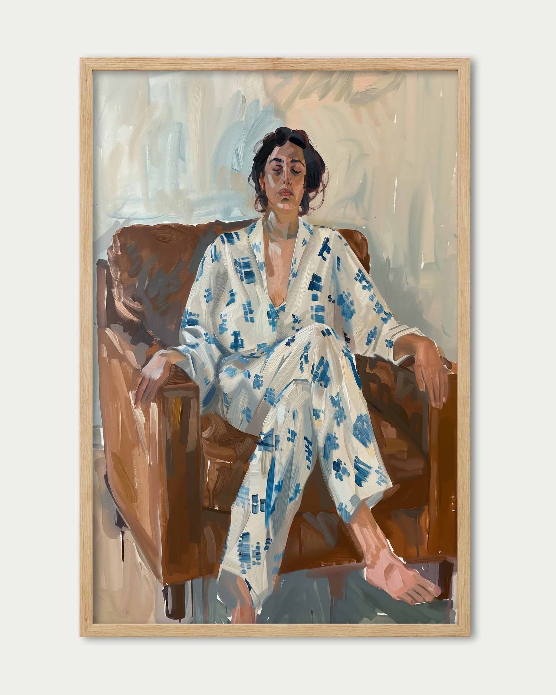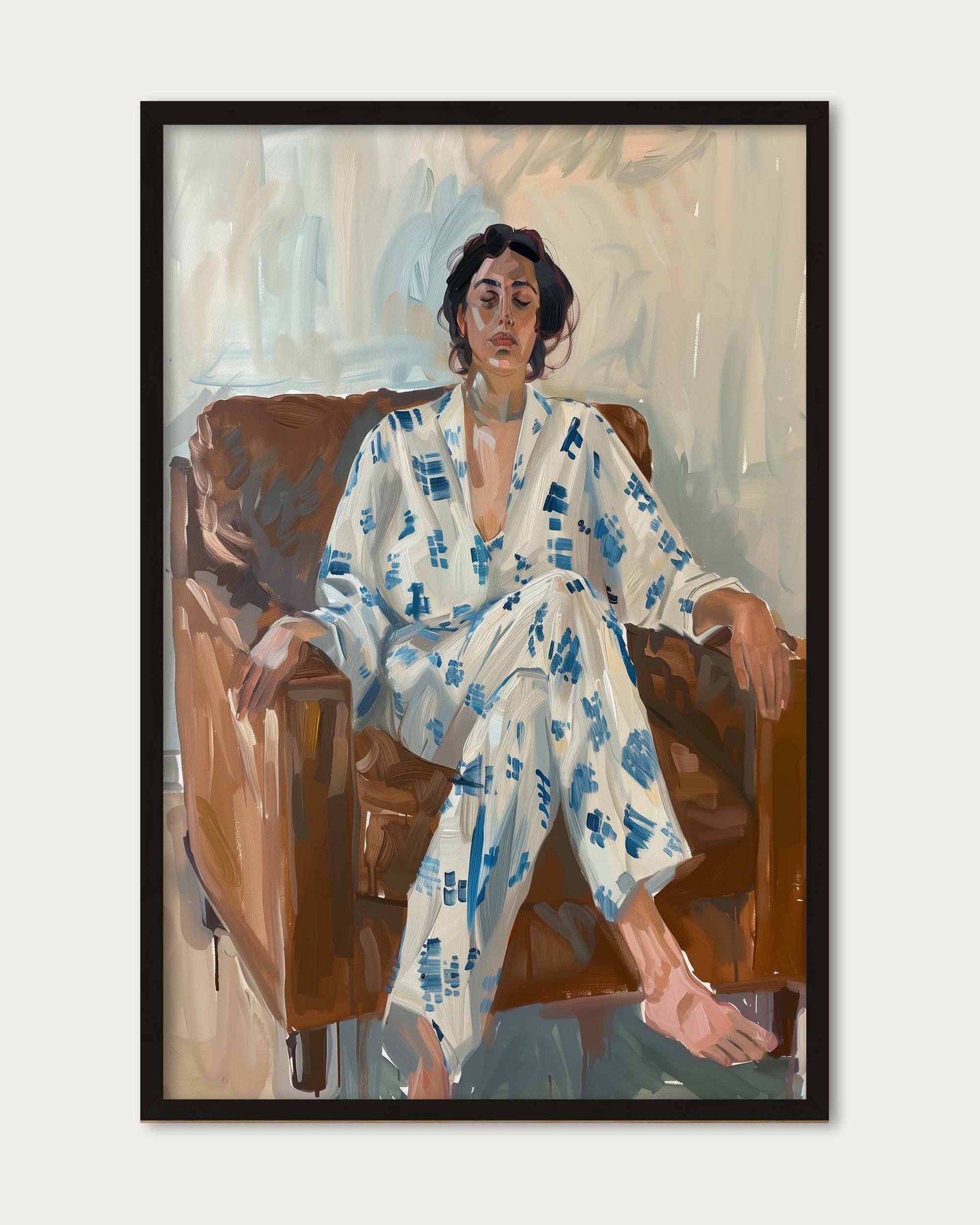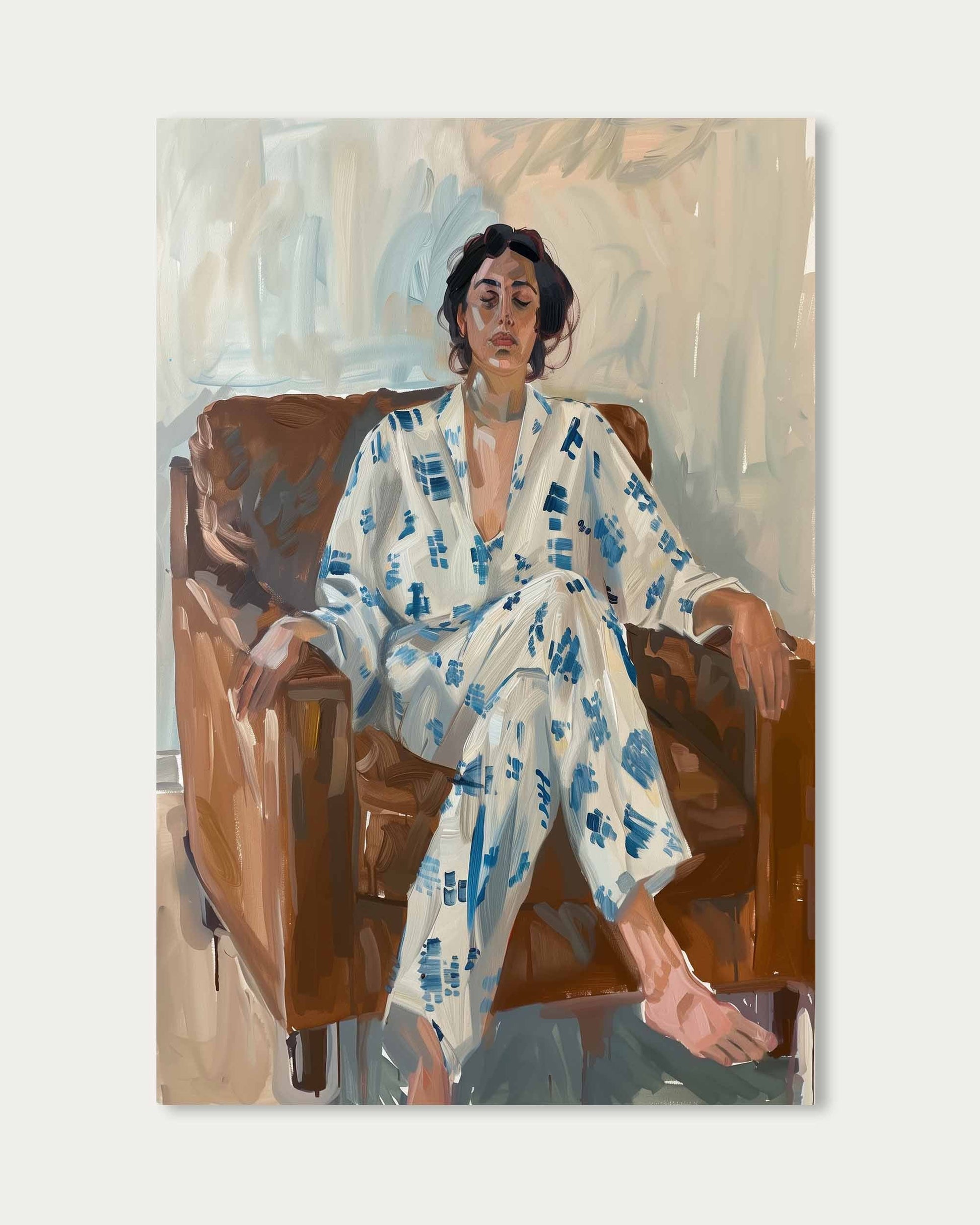 The Silk On Leather Wall Art features a captivating oil painting of a woman seated on a leather armchair, rendered in rich brown shades. This figurative portrait exudes warmth and sophistication, making it a striking and elegant addition to any space seeking timeless artistic depth.