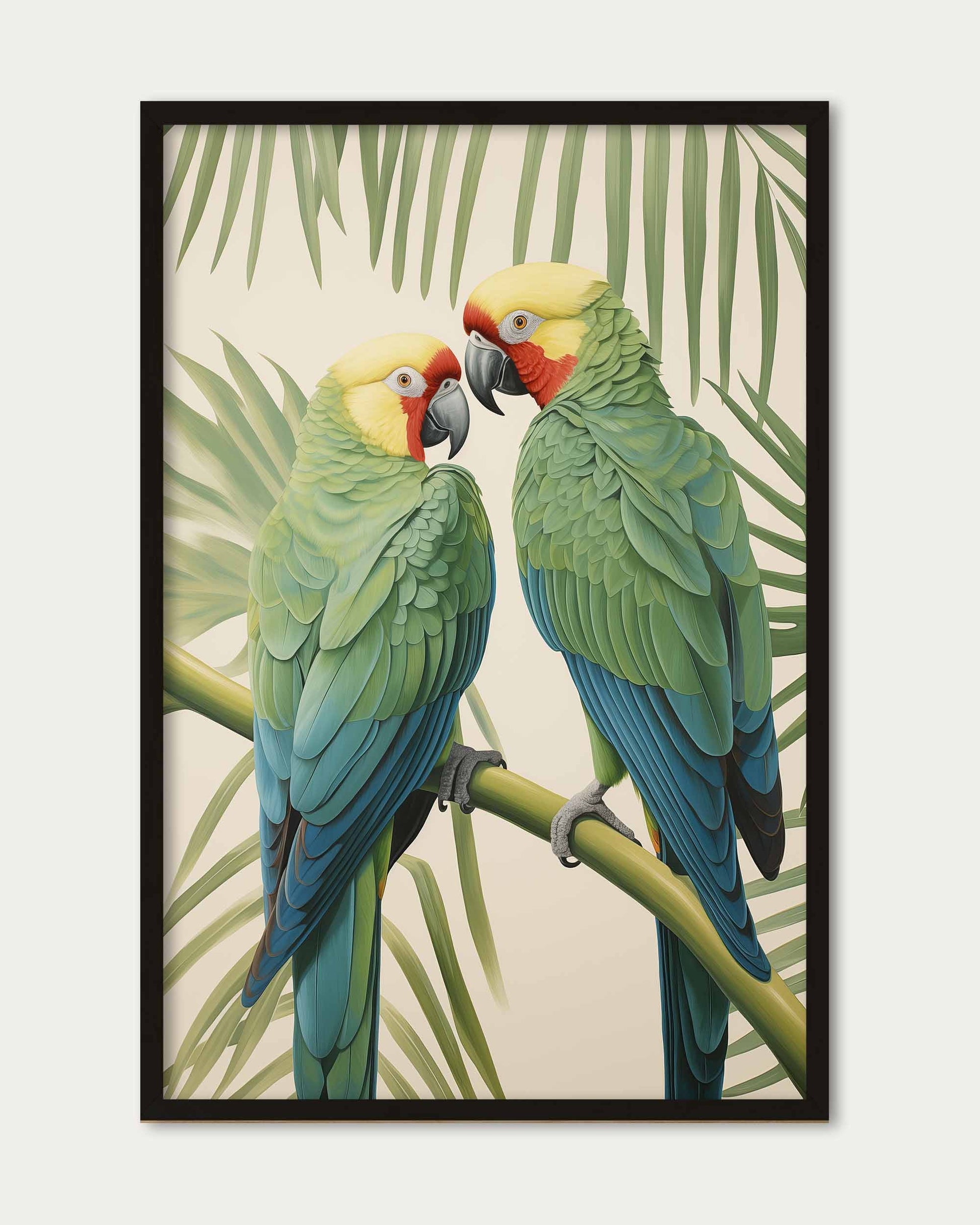 The Two Parrots Wall Art Print beautifully captures a pair of green parrots with striking blue tails perched gracefully on a branch. This vibrant artwork brings a lively and charming touch of nature to your space, perfect for adding colour and warmth with a sophisticated, natural flair.